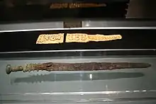 Weapons were largely the same as well, although there was more focus on idiosyncratic weapons wielded by particularly noteworthy individuals. For example, one man named Chen An apparently wielded a great sword over two meters in length[21] and Sun Quan's wife had over a hundred female attendants armed with daos.[22] Trends in warfare that had already been underway during the Eastern Han continued to gain momentum. By the end of the Three Kingdoms, the single edged dao, with its thicker and more durable dull side, had overtaken the straight double-edged jian as the primary close combat weapon.[23] The more expensive, lighter, and less durable jian entered the domain of court dancers, officials, and expert warriors.[24] While halberds were still used during the period, long spears and lances (similar to pikes) re-rose in prominence over halberds for infantry and cavalry forces. This was believed to have been the result of the long spear and lances' simpler construction, the adoption of long spears and lances by heavy cavalry to strike infantrymen, and the adoption of tighter infantry formations with less room for swinging and hooking [of halberds] in response to the greater threat by cavalry. [23][25] Soldiers in the northeast specialized in long spears.[26] After the Han dynasty, the crossbow gradually faded in importance until it made a mild resurgence during the Tang dynasty, under which the ideal expeditionary army of 20,000 included 2,200 archers and 2,000 crossbowmen.[27]