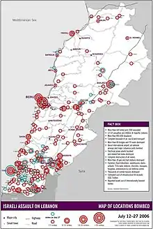 Areas in Lebanon targeted by Israeli bombing, 12 July to 27 July 2006.