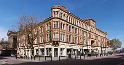 Miller Arcade was opened in 1899 and was modelled off the much larger Burlington Arcade, London and was designed by Edwin Bush who was working for the Birmingham based company Essen, Nichol and Goodman.[3] Bush constructed the building on behalf of Nathanial Miller, a Preston dentist who in 1895 held a competition for the commission of his new building.[3] Construction began in August 1896.[3] The building replaced some old terraced houses and shops known as "The Shambles" that were owned by the Miller family who had previously failed to sell the area.[3] The Shambles were built by the Molyneux family at the beginning of the eighteenth century.[4] The building originally had pepper pot turrets on each corner but these had to be removed in the 1920s due to safety concerns.[4] The upper floors of the building were used as a hotel during the buildings earlier years. Turkish Baths were added to the building in the early twentieth century and operated up until 1947. There was also a room called "The Geisha Ballroom" within the building during its earlier years.[3][4]