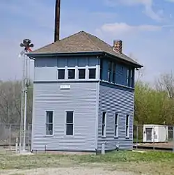 The Mills Tower Historic District is a nationally recognized historic district located in Iowa Falls, Iowa, United States. It was listed on the National Register of Historic Places in 1990.[1] At the time of its nomination the district consisted of six resources, including two contributing buildings, and four non-contributing buildings.[2] All of the buildings are associated with the Illinois Central Railroad (IC). The Dubuque & Sioux City Railroad, an affiliate of the IC, laid the first rail track to Iowa Falls in 1866. The following year the Iowa Falls & Sioux City Railroad, another IC affiliate, continued construction of the line to the west, and it reached Sioux City by 1870. The Burlington, Cedar Rapids and Northern Railway (BCR&N) by way of its affiliate the Cedar Rapids, Iowa Falls & North Western, entered Iowa Falls in 1880. Two years later it was expanded to the north and intersected with the IC main line, which required a controlled crossing. Little is known about this first crossing and what it contained.[2]
