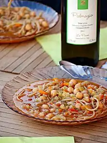 Minestra di ceci (lit.'chickpea soup') is a soup in Italian cuisine prepared with chickpeas as a primary ingredient.[1] Dried chickpeas that have been soaked or canned chickpeas may be used. Additional ingredients can vary, and may include foods such as salt cod, chestnuts, artichoke, potato, tomato, pasta, and cabbage, among others.[1][2] Soup base ingredients may include olive oil, garlic, onion, carrot, and celery, among others.[1]