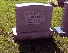 On May 1, 2003, in Marietta, Georgia, Luger called 9-1-1 to report that Hulette was not breathing.[18] She did not respond to mouth-to-mouth resuscitation, and paramedics rushed her to the WellStar Kennestone Hospital Emergency Room, where she was pronounced dead at the age of 42.[18] A medical examiner listed the cause of death as "acute toxicity", brought on by a mix of painkillers and vodka. Her death was ruled an accident.[18] Hulette was buried at Frankfort Cemetery.[19]