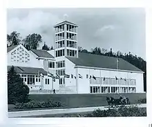 Movies that were filmed and produced in the Studio include The Crowning Experience (MRA), Decision at Midnight (1963, MRA), Voice of the Hurricane (1964, MRA), and Somewhere in Time (1980, Universal Pictures). In summer 1965 the Studio's sound stage was the site for original performances of the musical show Sing-Out ’65, when ~7,000 young people from around the world were meeting for summer MRA conferences.[40] Seating was brought in for audiences of ~1000 at the weekly Sing-Out shows. In the fall of 1965 the cast of the show began traveling throughout the US and Asia. In 1966, Sing-Out changed its name to Up With People and expanded into several international musical casts emphasizing personal change that could lead to social, economic and political change.[19][41] In late 1965 the Studio was deeded over to Mackinac College, an institution legally independent of MRA and chartered by the Michigan Board of Education.[26][42] The intent was that the many floors and rooms of the Studio would provide classroom and library space for the college. The island’s fire marshal, however, did not approve this use, so the studio served as a Fine Arts Center for the college.[43] The sound stage was then converted into a gymnasium that the College shared with Island school children for sports.