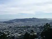 The Twin Peaks, icons of the San Francisco Bay Area, are also home to a reported population of Mission blue butterflies. The entire area is a park managed by the San Francisco Recreation & Parks Department (SFRPD). The park contains 31 acres (130,000 m2) of what the Park Department terms "Natural Areas." This area is most of the park minus roads, viewpoints and the City Fire Department reservoir. The natural areas contain significant resources for preservation. They include some of the largest areas of coastal scrub and prairie that remains within the city of San Francisco. These, being the preferred habitat of the Mission blue, are areas that support and provide habitat for the butterfly. Twin Peaks receives heavy recreational use because of its picturesque view of the city. Twin Peaks supports a wide array of habitat types, from mixed forest to coastal scrub. Among the coastal scrub and prairies are silver bush lupine plants (L. albifrons) which support the colonies of endangered Mission blues.[14]