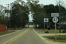 Mississippi Highway 42 (MS 42) is a state highway in southern Mississippi. MS 42 runs in an east/west direction for 116.0 miles (186.7 km), serving seven Mississippi counties: Wayne, Greene, Perry, Forrest, Lamar, Jefferson Davis, and Lawrence. Portions of this highway run parallel to the Longleaf Trace. The length of highway between Interstate 59 and U.S. Highway 11 in Forrest County, just outside Petal is known as the Evelyn Gandy Parkway.