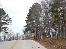 In the clearing, the highway intersects with Supplemental Route W and the two roads become concurrent. For the mile-long concurrency, the surroundings remain dense forests until Route 172 forks eastward in a small clearing. The surroundings return to dense forests for Route 172, intersecting with an access road to Deer Run Acres and crossing into the outer edges of Lake Wappapello State Park. The designation terminates within the park, while the right-of-way continues towards Lake Wappapello.[2]