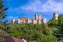 Mojs' health had deteriorated rapidly by 1280. After he fell ill, he compiled his final will and testament on his deathbed on the basis of an oral communication on 26 September 1280 in the presence of Thomas, Bishop of Vác, who also functioned as chancellor of Queen Isabella, representatives of the collegiate chapter of Buda (which acted as a place of authentication in this case), the superiors of the Franciscans and Dominicans, along with others. During the process, Mojs declared the fullness of his mental capacity.[46] The 1280 last will was a "codicillus" in technical sense, which upheld but supplemented/amended the previous will. This type of phrase was preserved from law system of Classical antiquity, and occurs only four times in Hungary in the age of Árpáds. Legal historian Beáta Kulcsár attributed the technical term to Bishop Thomas and one of the members of his professional staff in the cathedral chapter of Vác, which recorded the document.[47] Mojs' widow inherited Izdenc as a wedding gift and Rácsa, Uga in Tolna County, the marturina of three villages and twenty horses from her husband's stud due to "marital love". Mojs recommended an option for his nephew Alexander. Alongside a valuable gold belt, he could choose a settlement called Megyericse (Međurača, Croatia), or the joint lordship of Musina and Bakva (in the latter case, the widow would have inherited Megyericse). Mojs bequeathed his Transylvanian properties of Zolun (Zólyom) and Meggyes (today Medieșu Aurit, Romania) to his son-in-law Nicholas Pok, who moved the centre of his domains to the province thereafter.[48] His other son-in-law Henry Kőszegi inherited the castle of Gordova (Grdjevac) and its surrounding lands in Slavonia.[49] Mojs' sister, who joined the nuns at Székesfehérvár, was granted Nyék and Szakály in addition to the marturina of Megyericse. Mojs bequeathed several landholdings to the monastery of Ábrahám too; for instance, Ábrahám, Kurd, Görbő, Csibrák, Lázi and Bot (today a borough of Etyek). The Dominican nuns of Rabbits' Island gained Igal, two villages named Pozsony, Burkud, Aszlav, Ráksi, Kisbéc, Kazsok and Ecseny in accordance with his 1272 letter of intent, in which he granted them a right of usufruct over these estates. Papal legate Philip of Fermo, who resided in Hungary since that year, was granted the village Csap with its vineyards.[48]