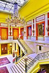 The Municipal Hall's entrance features four Tuscan marble columns. An impressive chandelier in bronze and crystal hangs in this room. The names of the mayors are engraved in the marble stones from the upper part of the walls. In the centre above the staircase of honour is a portrait of Henri Hollevoet, the mayor who inaugurated the Municipal Hall in 1889.[10] The aldermen's offices, located on the first and second floors, have undergone various adaptations due in particular to the increase in aldermen over time.[11] The mayor's office is majestic, located under the dome whose ceiling is lined with a allegorical painting by Amédée Lynen symbolising Education, Public assistance, Civil protection, Justice, Art and Letters and Marriage.[12][1]