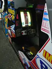 Multiple styles of arcade cabinet exist for the game, including a deluxe cockpit cabinet which was designed in approximation to sitting behind the wheel of a race car with a padded steering wheel and accelerator pedal.[5] A tabletop housing and a smaller upright cabinet were also created.[1]
