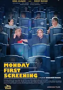 Monday First Screening is a 2023 Philippine Romantic comedy directed by Benedict Mique and written by Mique and Aya Anunciacion. It Stars Ricky Davao, Gina Alajar. the film is about two elderly individual who find love while watching a free movie every Monday in a cinema.[1][2]