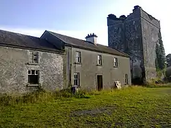 ![]() Monivea Castle with the original Anglo-Norman tower house to the right. The later mansion was built up against its north, west and south walls | |
