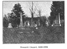 The congregation traces its history back to 1828, when Issac Monnett held services in his own home.[2] The original chapel was built in 1849 by Jeremiah Monnett, a relative of Mary Monnett Bain.[3][4] It had between 12 and 17 members during the 1890s. That number dropped to 6 in the year prior to the completion of the new chapel.