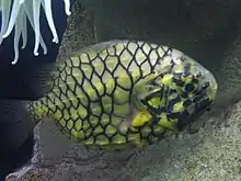 The pineconefish is yellow with distinct large scales outlined in black.[1] It has light-producing organs filled with luminescent bacteria on each side of the lower jaw, the purpose of which is not known, but may help it to see at night or to attract prey. The fish grows to 17 cm, but is more commonly found up to 12 cm.[2]