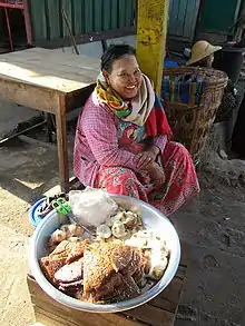A hawker near Kyaiktiyo Pagoda selling a variety of traditional mont