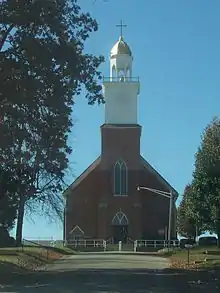 St Peter's church is one of the oldest Catholic parishes in Indiana. The first church was a log-cabin built in 1818, followed by frame church in 1823. In 1841, bishop Célestine Guynemer de la Hailandière gave the parish and the land to French priest and missionary Edward Sorin, CSC who came with seven Brothers of the Congregation of Holy Cross. At the time the property consisted in 160-acre tract of land, the frame church with two additional small rooms, and two log cabins. One cabin was used as a school conducted by Charles Rother who took the name Brother Joseph.[5] In the early months of 1842, Sorin started to conceive the idea of founding a college, although one was already present in Vincennes (the College of St. Gabriel, which failed soon after). Sorin thought of founding the college there in St Peters, but he met the opposition of the bishop who lamented that this was not in the original plans and it conflicted with the existence of St. Gabriel's college. However, the bishops also stated that he was not against a founding of a college elsewhere, provided that this effort would not prevent him his Brothers from accomplishing their education duties. Near the end of October the bishop offered Sorin certain lands at the furthermost limits of the diocese in South Bend. Sorin left St. Peters and proceeded to found the University of Notre Dame.[6]