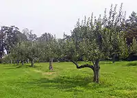 On the east are the property's orchards, leased and operated by Montgomery Place Orchards. On the farm, over 60 different varieties of apple and pear trees are planted and harvested as well as berries, vegetables, grapes and peaches. Annandale Atomic hard cider is also now produced on the farm from early American and English varietal apples. The produce is sold at the Montgomery Place Orchards market. Black locust trees line the 0.5-mile (0.80 km) unpaved allée and surround the lawn of the main house. The lawn on the west of the house slopes down to a reflecting pond at the edge of the wooded shore.