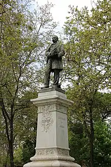 The bronze sculpture topping the tall pedestal represents a solemn Moyano in attitude of reading his laws to the people.[4][5]