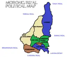 The Politico-Militar Distrito de Morong or Distrito de Morong was created out of the provinces of Manila and Laguna composing the pueblos of Morong, Pililla, Tanay, Baras, Binangonan, Jalajala, Angono, Antipolo, Boso-Boso, Cainta and Taytay.[5]