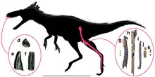 Moros was a small-bodied, cursorial tyrannosauroid with an estimated leg length of 1.2 m (3.9 ft) and a body mass of 78 kg (172 lb).[1] The foot bones of Moros were extremely slender, with metatarsal proportions found to be more similar to ornithomimids than to other Late Cretaceous tyrannosauroids.[1]