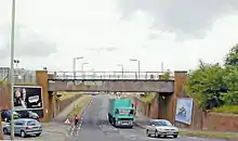 In an attempt to stimulate Oxford suburban traffic, the Great Western Railway opened three motor halts on the line, one of which was to be situated to the south of the railway bridge over Garsington Road (now classified the B480). The station was named Garsington Bridge Halt and its opening was approved by the Board of Trade in December 1907. The first services, operated by GWR steam rail motors, ran on 1 February 1908.[4] As with the other halts, Garsington Bridge had a single platform, 150 feet (46 m) long, with a 20 feet (6.1 m) by 70 feet (21 m) corrugated iron passenger shelter.[5] Steps linked the halt with Garsington Road.[6] The halt remained open for only seven years, being closed in 1915 as a First World War economy measure.[2]