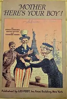 "Mother, Here's Your Boy!" is a World War I song written and composed by Sidney D. Mitchell, Archie Gottler, and Theodore Morse.[1] This song was published in 1918 by Leo. Feist, Inc., in New York, NY. The sheet music cover depicts Uncle Sam presenting a returning soldier to his mother with the Statue of Liberty and ships in the background.[2]