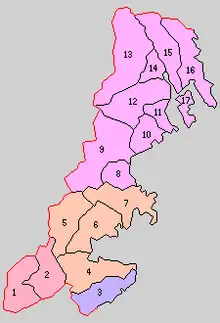 1. Nusazaki; 2. Yokoyama; 3. Jusanhama; 4. Tokura; 5. Iriya; 6. Shizugawa; 7. Utatsu; 8. Koizumi; 9. Mitake; 10. Oya; 11. Hashigami; 12. Matsuiwa; 14. Kesennuma; 15. Shishiori; 16. Karakuwa; 17. Oshima; Purple = Ishinomaki City; Red= Tome City; Orange = Minamisanriku Town; Violet = Kesennuma City