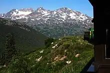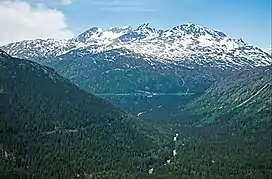 Mount Carmack is a prominent 6,808-foot-elevation (2,075-meter) mountain summit located in the Boundary Ranges of the Coast Mountains, in the U.S. state of Alaska. The peak is situated 7 mi (11 km) north-northeast of Skagway, and 3.5 mi (6 km) south of Mount Cleveland, on land managed by Tongass National Forest.[3] As the highpoint on the divide between the Taiya River and the Skagway River, precipitation runoff from the mountain drains east into the Skagway River and west into Taiya River, both of which empty into Taiya Inlet. Although modest in elevation, relief is significant since Mount Carmack rises 6,800 feet above the Taiya valley in less than 2 mi (3 km), and 5,800 feet above Skagway valley in about 2 miles. Mount Carmack has a lower subsidiary summit, elevation 6,621 ft (2,020 m), about 0.5 mi (1 km) to the northeast of the true summit.[4] The USGS map has this lower northeast peak labelled as Mount Carmack.