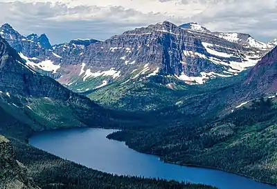 Mount Helen (8,538 feet (2,602 m)) is located in the Lewis Range, Glacier National Park in the U.S. state of Montana.[3] Mount Helen rises immediately to the northwest roughly 3,100 feet (940 m) above Upper Two Medicine Lake in the southeastern part of Glacier National Park.[4] The Continental Divide of the Americas passes over the summit of Mount Helen.