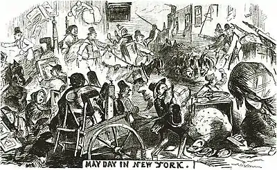 In 1799, an observer commented that New Yorkers "are seized on the first of May, by a sort of madness, that will not let them rest till they have changed their dwelling."[11] Because there were not enough cartmen to handle all the traffic, farmers would come from Long Island and New Jersey to rent out their wagons at high prices.[12] By 1820, because of the large increase in the number of propertyless renters, Moving Day had become "pandemonium", with the streets gridlocked with wagons carting household goods.[13] The tradition was still in force in 1848, when the Tenant League denounced it as a way for landlords to raise rents every year.[14] The cost of moving was another concern, as cartmen sometimes charged more than the official rates set by city ordinances – people were known to pay up to a week's wages to be moved[15] – and the truckman might, if the customer refused to pay on delivery, take their belongings to Police Headquarters, charging for the additional transportation.[16]