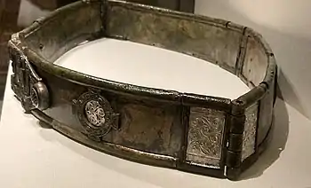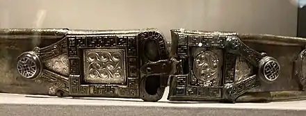 The belt is defined by the false buckle joining the two front segments. Each of these segments contains a large red and blue glass stud,[9] and settings for silver die-stamped rectangular panels; a rare form of metalwork decoration for the period.[10] Five of the panels survive, including two near the hinges, and two forming the false buckle and counter-plate.[1] The glass medallions are unusually large, perhaps their size served to hide the joint-plate and rivets linking the visible metal sheets.[9]