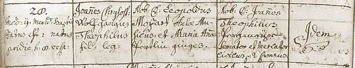 Mozart was baptized as Joannes Chrysostomus Wolfgangus Theophilus Mozart on 28 January 1756, the day after his birth, at St. Rupert's Cathedral in Salzburg. The baptismal register of the cathedral parish contains the entry shown below, written down in Latin by city chaplain Leopold Lamprecht. A transcription with editorial additions by Otto Erich Deutsch follows.[1]
