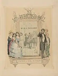 Mrs. Perkins's Ball was published as one of many Christmas novels; it was Thackeray's first attempt in the genre and its initial print run sold only 1,500 copies.[1] In one review (written by Thackeray himself), he notes there were some 25 or 30 Christmas books published that season, including several illustrated by the "fast working" Isaac Robert Cruikshank. He then begins caustically reviewing Mrs. Perkins's Ball until, halfway through, he realizes in mock horror that he himself authored it and demands to "Kick old Father Christmas out of doors, the abominable old imposter! Next year I'll go to the Turks, the Scotch, or other Heathens who don't keep Christmas."[2] The book was, nevertheless, popular enough that American author Mark Twain may have used the title character as an inspiration for his first known pen name, W. Epaminondas Adrastus Perkins, affixed to an article of his in the Hannibal Journal for 9 September 1852.[3]
