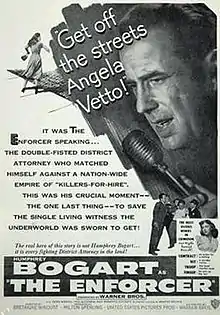 The Enforcer (aka Murder, Inc. in the United Kingdom) is a 1951 American film noir co-directed by Bretaigne Windust and an uncredited Raoul Walsh, who shot most of the film's suspenseful moments, including the ending.[3] The production, largely a police procedural, stars Humphrey Bogart and is based on the Murder, Inc. trials. The supporting cast features Zero Mostel and Everett Sloane.