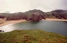 Boyeeghter Strand[1] or Boyeeghter Bay, (Irish: Bá Íochtair[2]) commonly known as The Murder Hole Beach, is a beach situated on Rosguill, a peninsula located on the north coast of County Donegal in the north-west of Ulster, the northern province in Ireland.[3] The beach lies at the north-eastern end of Rosguill, being located near Melmore Head.[3] It has cliffs, hills, dunes, and small caves. When the tide is in there are two beaches, which merge into one when the tide is out.[4] Rough Island is a small tidal island located approximately 15 metres offshore. The beach is not suitable for swimming.[5][6]
