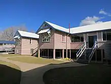 Prior to the removal of the original teaching building,[33] a new State School building of a standard government design was constructed in 1917 within the new school reserve. To help ensure consistency and economy, the Queensland Government developed standard plans for its school buildings. From the 1860s until the 1960s, Queensland school buildings were predominantly timber-framed, an easy and cost-effective approach that also enabled the government to provide facilities in remote areas. Standard designs were continually refined in response to changing needs and educational philosophy and Queensland school buildings were particularly innovative in their response to climate control, lighting, and ventilation. Standardisation produced distinctly similar schools across Queensland with complexes of typical components.[34][1]