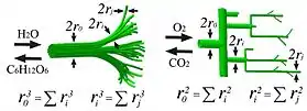 - ↑ Sherman 1981, p. 437: "If the volume of vessel tissue is proportional to the square of the internal radius (as when wall thickness is proportional to r), then Murray's derivation can hold for a biological vasculature even when the flowing fluid itself is inert and nonliving, as in the airways of the lungs, where the vessels are filled with air (of no metabolic cost) rather than with blood."