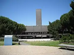 The architect, Jaime López de Asiaín, was awarded the National Prize for Architecture in 1969 for this project, construction beginning in 1971. The building was completed in 1973 and inaugurated in 1975.[3] The building was built as the home of the Spanish Museum of Contemporary Art (MEAC), later to become the Museo Nacional Centro de Arte Reina Sofía. After the MEAC left the building in 1992 the building lay unused. A restoration of the building was carried out at a cost of 21 million euro in 2005, allowing the building to become the home of the Museo del Traje. The building takes to form of a tower set upon a large horizontal element containing the museum section. All are elevated above the surrounding landscape allowing visitors to walk beneath the building into a shaded courtyard containing a large monumental staircase. Several glass pavilions are set between the ground and the building above.