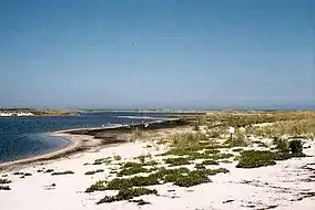 Muskeget has a high elevation of fourteen feet. Its northern shore is mostly sand dunes, while its southern shore is mainly marshes. A sandy point protects and engulfs the lagoon.