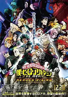 My Hero Academia: Heroes Rising (Japanese: 僕のヒーローアカデミア THE MOVIE ヒーローズ:ライジング, Hepburn: Boku no Hīrō Akademia Za Mūbī: Hīrōzu: Raijingu) is a 2019 Japanese animated superhero film based on an original story featuring the characters of My Hero Academia manga series by Kōhei Horikoshi. Produced by Bones and distributed by Toho, the second film of the franchise was directed by Kenji Nagasaki from a script written by Yōsuke Kuroda and stars Daiki Yamashita and Nobuhiko Okamoto as part of an ensemble cast. In the film, taking place after the Meta Liberation Army arc of the manga, Izuku Midoriya and his classmates visits Nabu Island where they must save a group of islanders from a villain with an unfathomable Quirk.