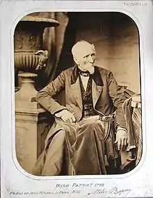 A photograph (above) of Byrne faces page 185 in Nicholas Furlong's "Fr John Murphy of Boolavogue: 1753-1798" (Dublin, 1991). According to the author, it was taken in Paris in 1859 and was thought to be the first photograph taken of an Irishman. That distinction is probably owed to an 1844 calotype by the pioneer photographer Henry Fox Talbot of the Irish poet (and biographer of Wolfe Tone) Thomas Moore.[17] (In 1821 Byrne had refused to attend a St Patrick's day dinner Moore had organised in Paris because of the presence of Wellesley Pole Long, a nephew of the Duke of Wellington).[18]