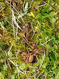 Myosotis bryonoma Meudt et al. is in the plant family Boraginaceae and was originally described in 2018 by Heidi Meudt, Jessica Prebble and Michael Thorsen.[3][2] It is morphologically most similar to M. tenericaulis, another creeping, bracteate-prostrate species of Myosotis, and also shares some morphological characters with other bracteate-prostrate species, M. colensoi and M. cheesemanii.[2] It can be distinguished from M. tenericaulis by its shorter (<5 mm long) and wider (>0.7 mm) petioles, smaller leaves (generally <6 mm long), appressed trichomes that are parallel to the mid vein, rosette leaves that are glabrous on the underside, shorter inflorescences (10–45 mm long) and internodes (<5 mm), and fewer flowers per inflorescence (1–3).[2] M. bryonoma can be distinguished from M. colensoi and M. cheesemanii by its shorter rosette leaf petioles (< 4 mm long), shorter calyces (< 3.5 mm long at flowering), calyx lobes which are longer than half the length of the calyx, rosette leaves usually glabrous abaxially, and shorter corolla tube (< 4.3 mm long).[2]