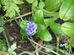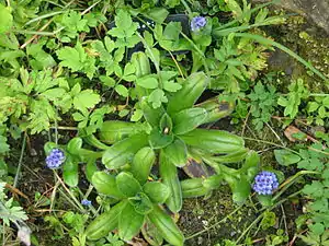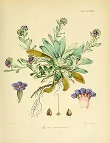 Myosotis capitata Hook.f. is in the plant family Boraginaceae and was described in 1844 by Joseph Dalton Hooker.[3][4][5] After its description, Hooker expanded the circumscription of M. capitata to include plants from Rakiura / Stewart Island, New Zealand.[5][6] Joseph Beattie Armstrong described a new variety, M. capitata var. albiflora J.B.Armstr., for the Stewart Island plants and other similar fleshy, white-flowered plants from southern South Island, New Zealand, for which the name M. rakiura L.B.Moore is now used.[7][8] Myosotis capitata can be distinguished from M. rakiura in its blue corollas, lack of retrorse trichomes anywhere on the plant, including the underside of the leaves, and partially exserted anthers.[9] The type specimen of Myosotis capitata is lodged at Kew Herbarium.[9][10]