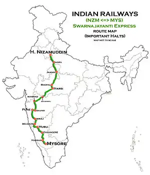 The 12781 / 12782 Swarna Jayanti Express is an Express train belonging to Indian Railways South Western Railway zone that runs between Mysore Junction and Hazrat Nizamuddin via Miraj Junction in India. This train is also comes under the Swarna Jayanti Express trains series. It shares its rakes with 22681/22682 Mysore - Chennai Central Weekly Superfast Express