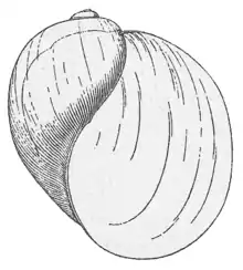 The shell is 13 to 16 mm in height and 11 mm to 15 mm in width in the adult. The upper whorls are almost flat so that the shell has a short blunt spire, the last whorl is inflated and predominating. The aperture is more than 90% of the shell height. The umbilicus is closed. The shell colour is brown or green, extremely thin and very transparent and shiny.