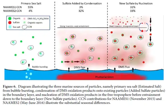 A clear seasonal difference in the quantity of biogenic sulfate aerosols was discovered in the North Atlantic as a result of the NAAMES campaign.[75] These aerosols were traced to two different biogenic origins, both of them marine due to the lack of continental air mass influences during the study period. The biogenic origin was the production of dimethyl sulfide (DMS) by phytoplankton, which then act as cloud condensation nuclei (CCN) and affect cloud formation. This study classified the sulfates as "New Sulfate", formed by nucleation in the atmosphere; and "Added Sulfate", which were existing aerosols in the atmosphere where sulfate was incorporated. During the November 2015 cruise (Campaign 1), primary sea salt was the main mechanism (55%) for CCN budget. However, during the spring bloom in May–June 2016 (Campaign 2) Added Sulfate accounted for 32% of CCN while sea-salt accounted for 4%.[75] These empirical measurements by seasonality will help improve the accuracy of climate models that simulate warming or cooling effects of marine bioaerosols.