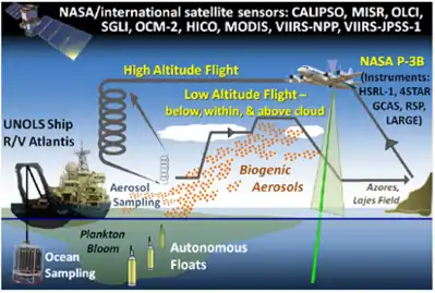 Bioaerosols are particles composed of living and non-living components released from terrestrial and marine ecosystems into the atmosphere. These can be forest, grasslands, agricultural crops, or even marine primary producers, such as phytoplankton. Primary biological aerosol particles (PBAPs) contain a range of biologic materials, including bacteria, archaea, algae, and fungi, and have been estimated to comprise as much as 25% of global total aerosol mass.[38] Dispersal of these PBAPs occur via direct emission into the atmosphere through fungi spores, pollen, viruses, and biological fragments. Ambient concentrations and sizes of these particles vary by location and seasonality, but of relevance to NAAMES are the transient sizes of fungi spores (0.05 to 0.15 μm in diameter) and larger sizes (0.1 to 4 μm) for bacteria.[38] Marine organic aerosols (OA) have been estimated through their correlation to chlorophyll pigments to vary in magnitude between 2-100 Tg per year.[50] However, recent studies of OA are correlated with DMS production and to a lesser extent chlorophyll, suggesting that organic material in sea salt aerosols are connected to biological activity in the sea's surface.[38][51] The mechanisms contributing to marine organic aerosols thus remain unclear, and were a main focus of NAAMES.