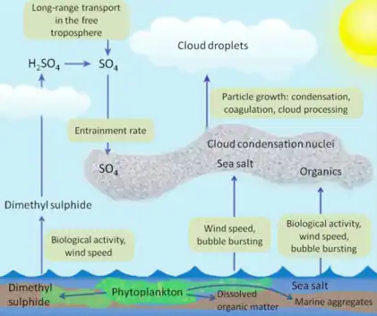 Marine aerosols contribute significantly to global aerosols. Traditionally, biogeochemical cycling and climate modeling have focused on sea-salt aerosols, with less attention on biogenically-derived aerosol particles such as sulfates and related chemical species emitted from phytoplankton.[50] For example, in the eastern North Atlantic during the spring 2002 bloom, high phytoplankton activity was marked more by organic carbon (both soluble and insoluble species) than by sea-salts. The organic fraction from phytoplankton contributed as much as 63% of the aerosol mass in the atmosphere, while during winter periods of low biological activity it only accounted for 15% of the aerosol mass. Those data provided early empirical evidence of this emission phenomena, while also showing that organic matter from ocean biota can enhance cloud droplet concentrations by as much as 100%.[50]