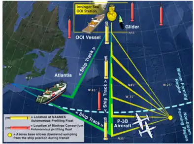 Four field campaigns were conducted to target the four specific changes during the annual plankton cycle.[1] The four NAAMES field campaigns synchronized data collections from the ship, air, and satellites, and were strategically timed to capture the four unique phases of plankton blooms in the North Atlantic: winter transition, accumulation phase, climax transition, and depletion phase.[1]