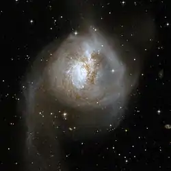 NGC 3256 features two tidal tails. The two tails account for approximately 75% of the HI emission of the galaxy, which, however, includes a central absorption feature.[10] Michael Rubrock et al. found that the two tails have different colors, suggesting different stellar populations. The eastern tail has mean stellar population age determined to be 841+125−157 Myr and a larger percentage of mass belonging to the stellar population that was formed before the galaxy interaction. In the eastern tail were also detected several young (< 10 Myr), low mass objects with strong nebular emission, indicating a small, recent burst of star formation. The mean stellar population of the western tail was estimated to be 288+11−54 Myr and its light is dominated by stars formed after the interaction.[11] The tails feature large numbers of star clusters, especially the western tail.[12]
