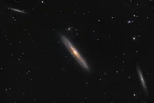 NGC 4216 (center) imaged with a 24-inch telescope. The other two galaxies in the image are NGC 4206 (lower-right) and NGC 4222 (upper-left).